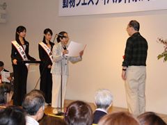 | 動物愛護協会賞の授与 | 湘南獣医師会齋藤会長より長寿表彰 | 表彰式に華を添えたミス鎌倉のお二人 |