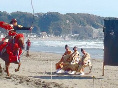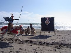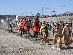 | ◎由比ヶ浜海岸(流鏑馬会場) 鎌倉では有名な伝統行事の一つ流鏑馬を、武田流鎌倉派によりご奉仕いただきました。 流鏑馬は本来、天下泰平、五穀豊穣を祈願する神事として執り行うものですが、今回我々は、「東日本大震災で亡くなられた方々のご冥福をお祈りし、また被災された地域や方々の一刻も早い復興を祈願して」という思いも込めて開催しました。 予測以上に多くのご観覧で、広い砂浜や一段上の国道沿いの遊歩道は人で埋まり、的に的中するたびに大きな歓声があがり、勇壮な姿をご覧いただくことができました。 |